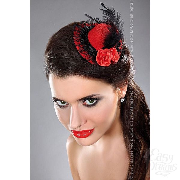 Секс шоп » Эротическое белье » Игровые костюмы » Головные уборы » Красная шляпка с чёрным кружевом, пером и цветочками из лент