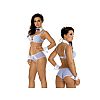 Комплект состоит из бюстгальтера купального типа, трусиков, пояса с подтяжками для чулок и белого воротничка.